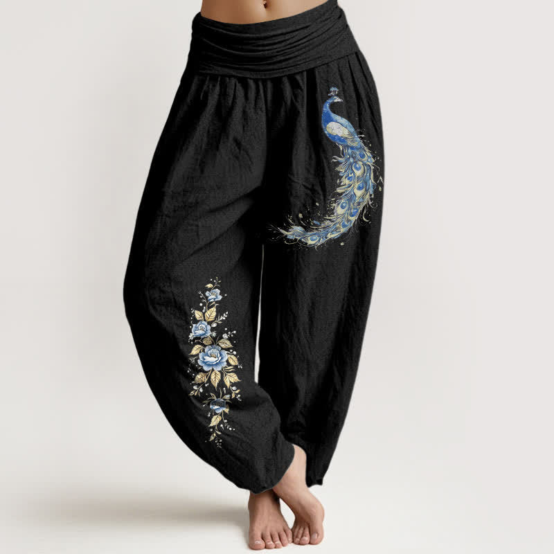 - Design: Peacock and clustered floral motifs act as the visual focal points, giving the pants a bohemian, artisanal feel. Contrasting blue, yellow and gold tones highlight the print against the natural cotton-like texture and emphasize the drape. These decorative elements suggest handcrafted and ethnic inspiration, enhancing casual, vacation and yoga looks.